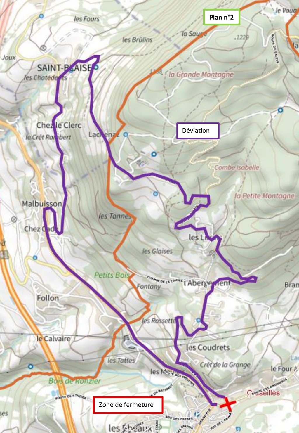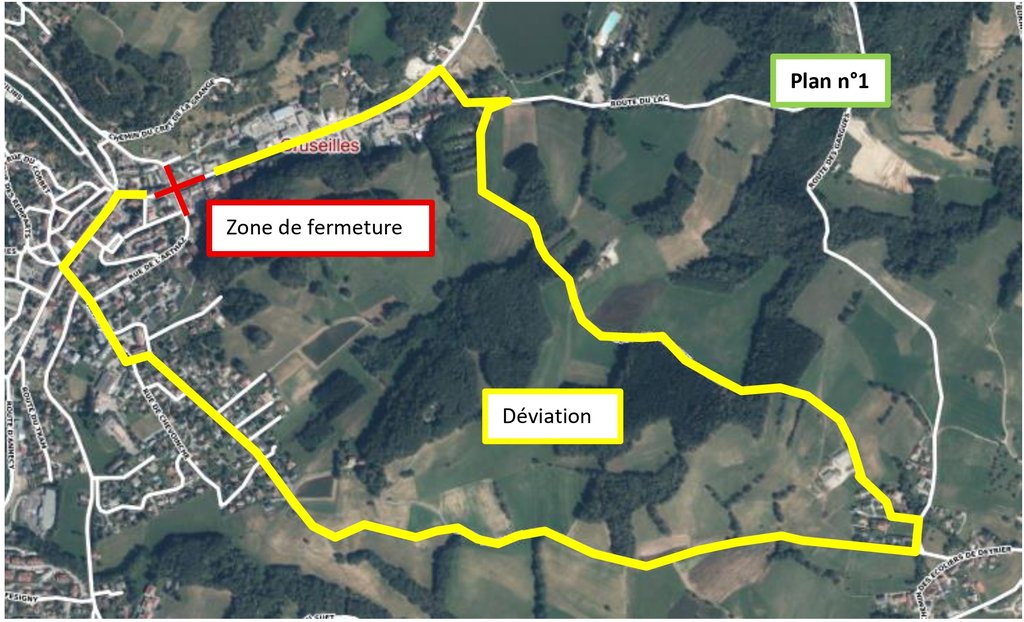 - Les véhicules venant de la route du Salève et voulant accéder à Cruseilles seront déviés par Saint-Blaise en passant par la route du Château (RD 341), puis la RD 223 pour reprendre la RD 1201 et inversement.