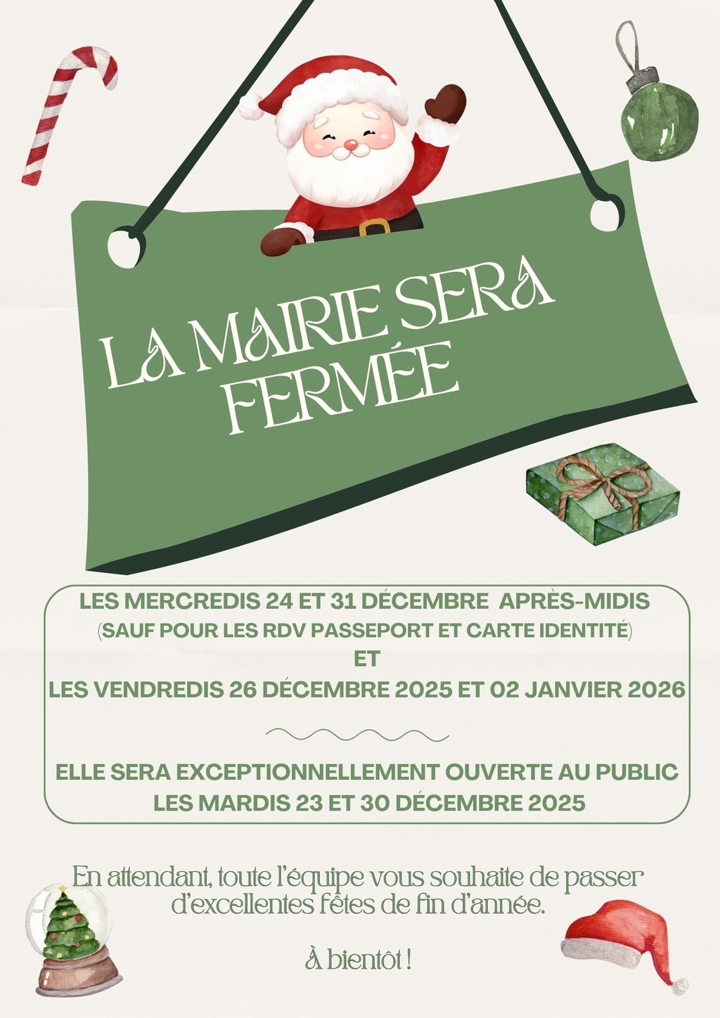 Pour les fêtes de fin d'année, la mairie fermera exceptionnellement ses portes les :