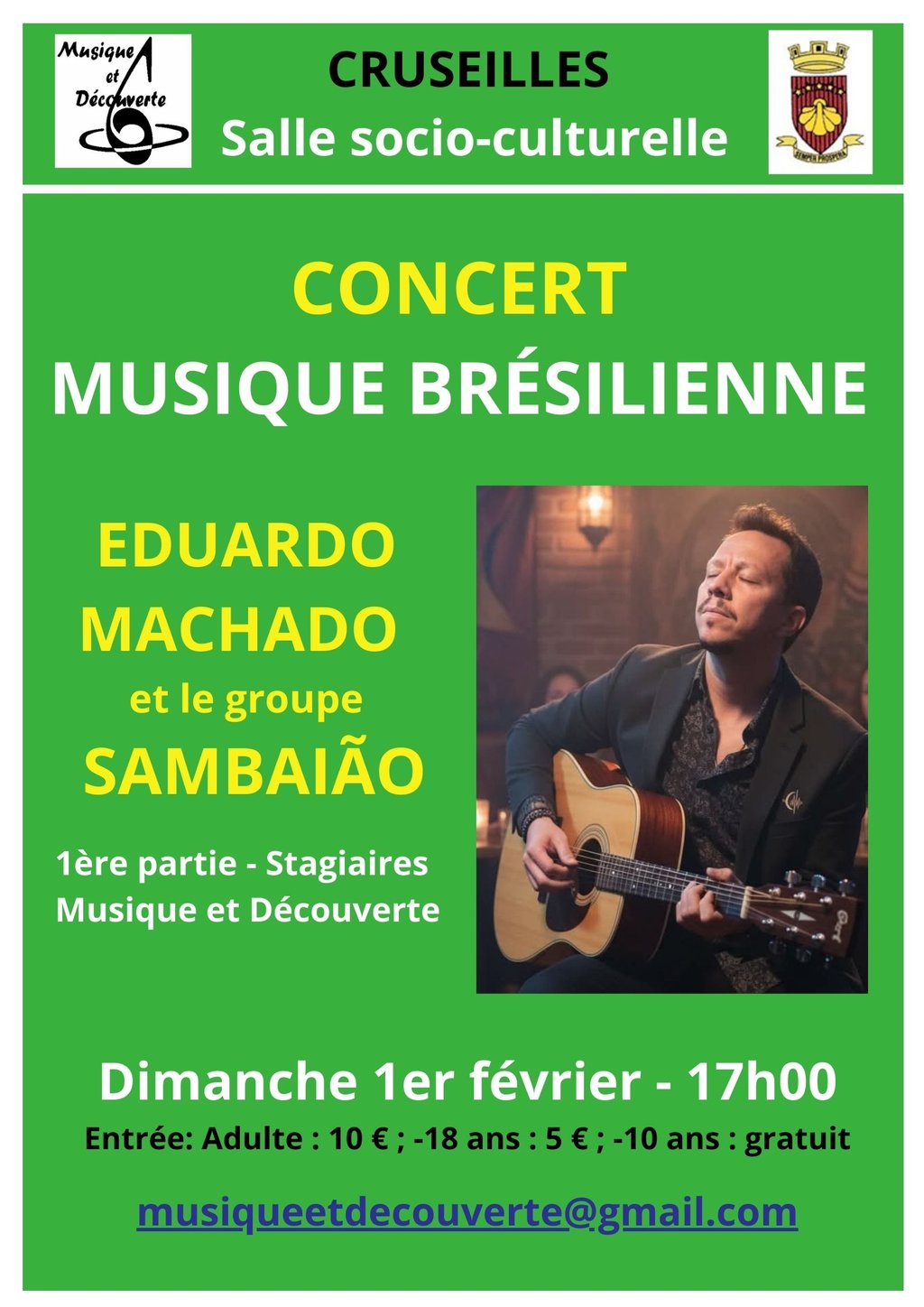 L’ensemble Musique et Découverte, à la suite de son stage annuel, vous propose un concert de musique brésilienne autour de Eduardo Machado et son groupe.