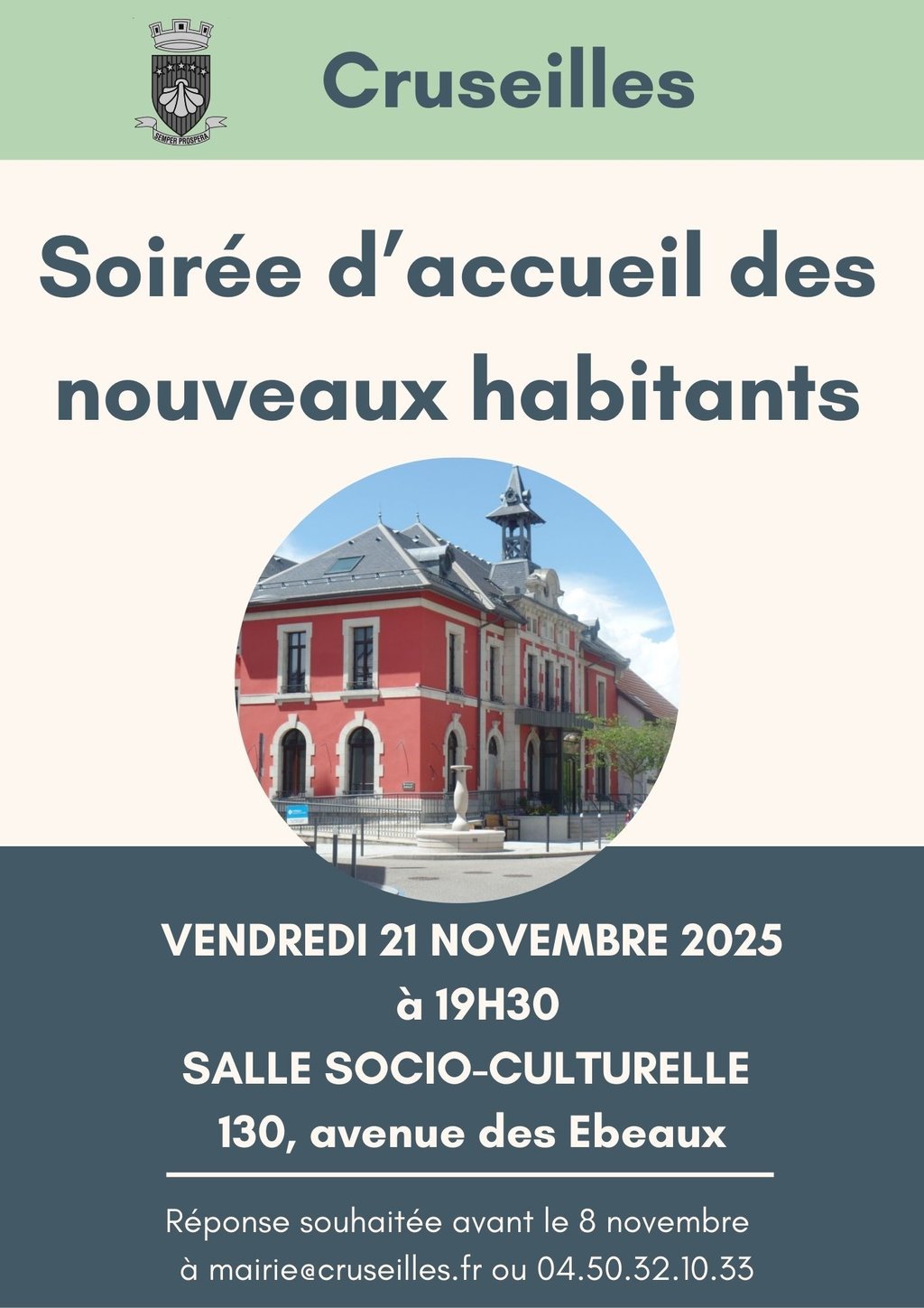 Les nouveaux habitants de Cruseilles sont invités le vendredi 21 novembre à 19h30 dans la salle socio-culturelle du gymnase des Ebeaux pour une présentation mutuelle, des échanges et pour partager un moment convivial.
