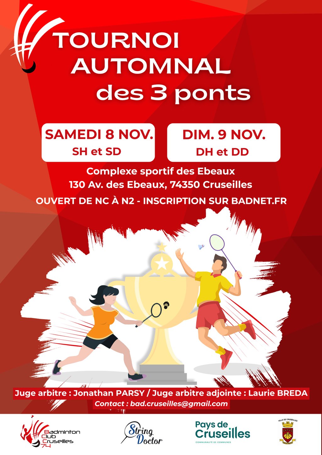 Le badminton club de Cruseilles organise son tournoi d'automne des 3 ponts ! Venez encourager les badistes qui joueront en simple le samedi et en double le dimanche ! Buvette et petite restauration sur place.