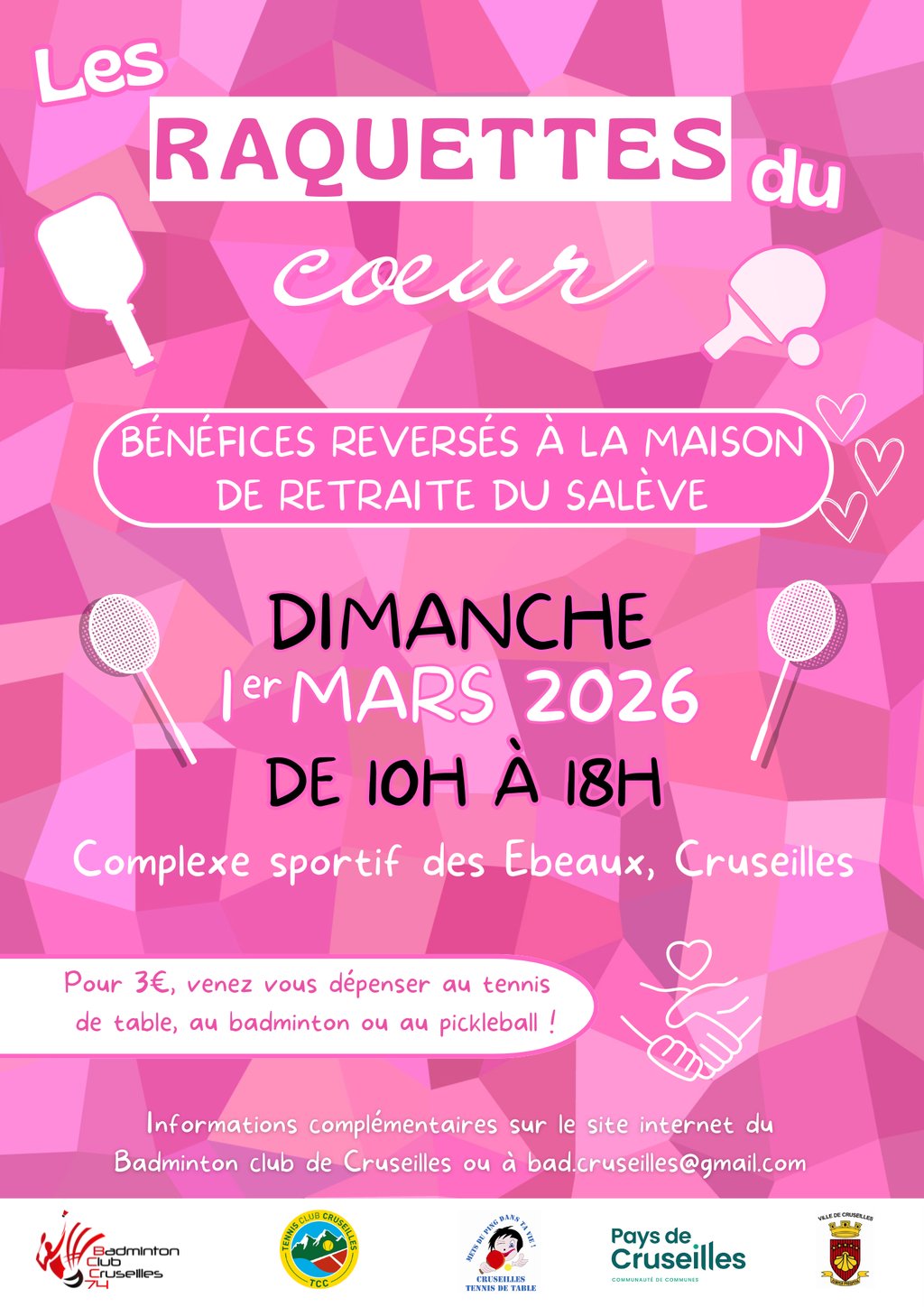 Le badminton club de Cruseilles organise, avec les clubs de tennis de table et de tennis, « les raquettes du cœur » le dimanche 1er mars 2026, de 10h à 18h au complexe sportif des Ebeaux.